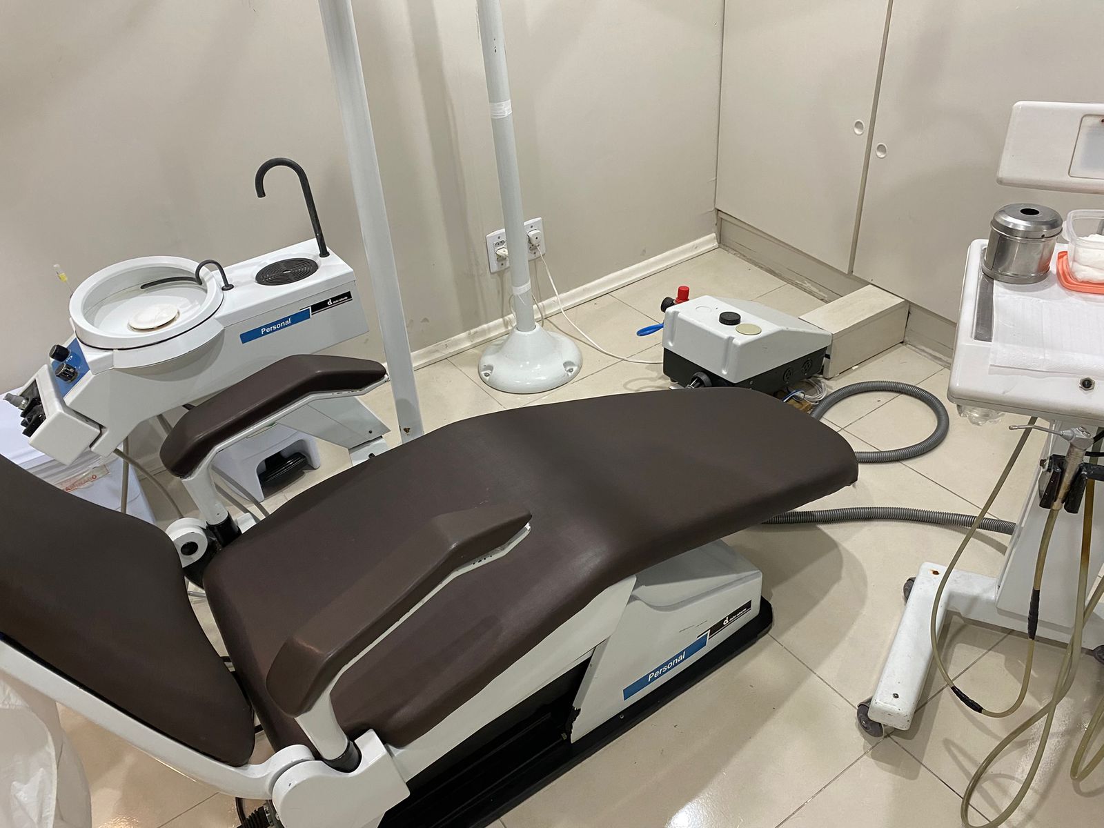 Cadeira odontologica Dabi, completa com mocho e mesa auxiliar.