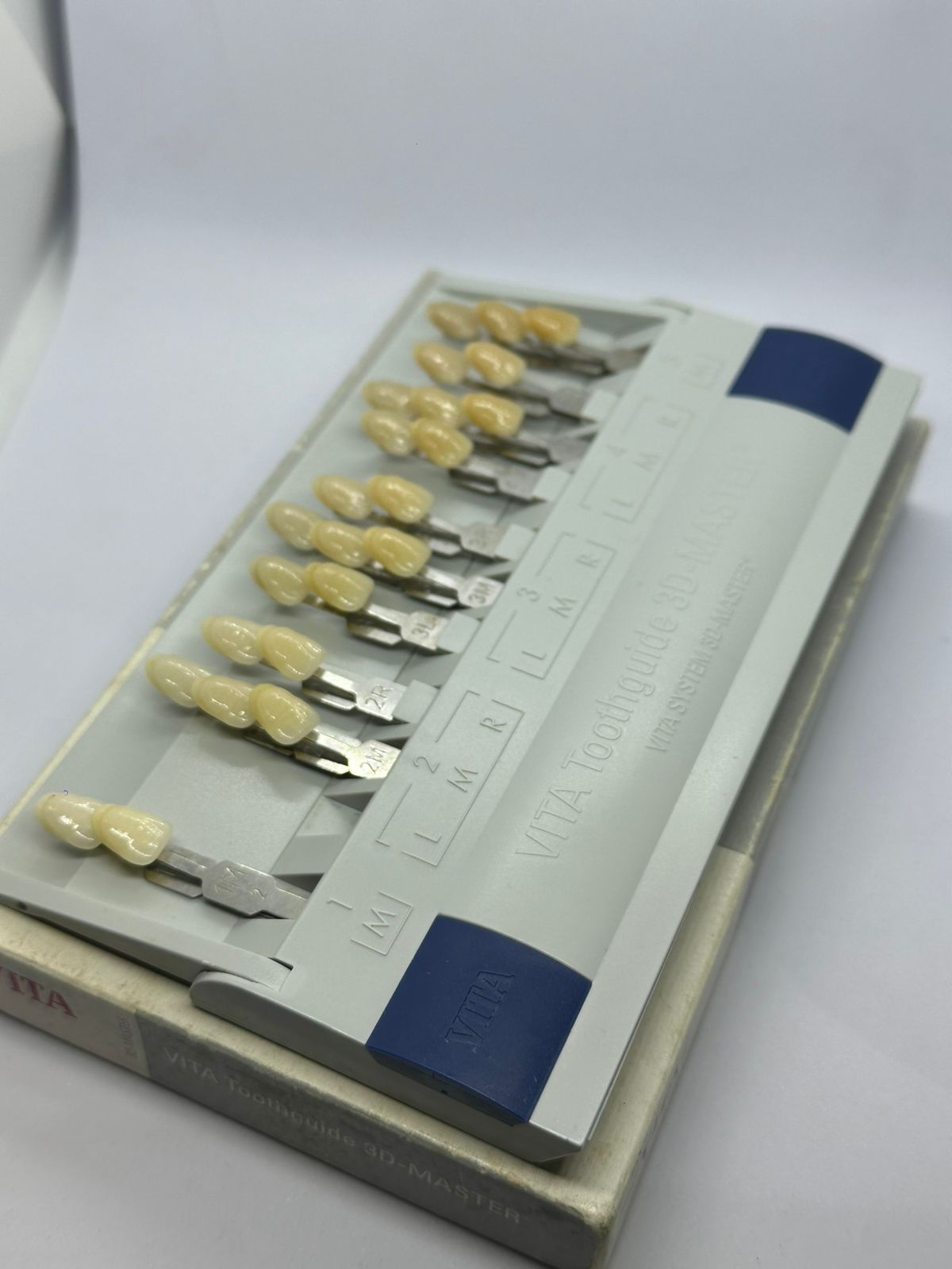 Escala de cor profissional utilizada para seleção precisa da cor dental em restaurações e próteses. O sistema 3D-Master da Vita permite identificar valor, croma e matiz de forma separada, oferecendo mais fidelidade estética.