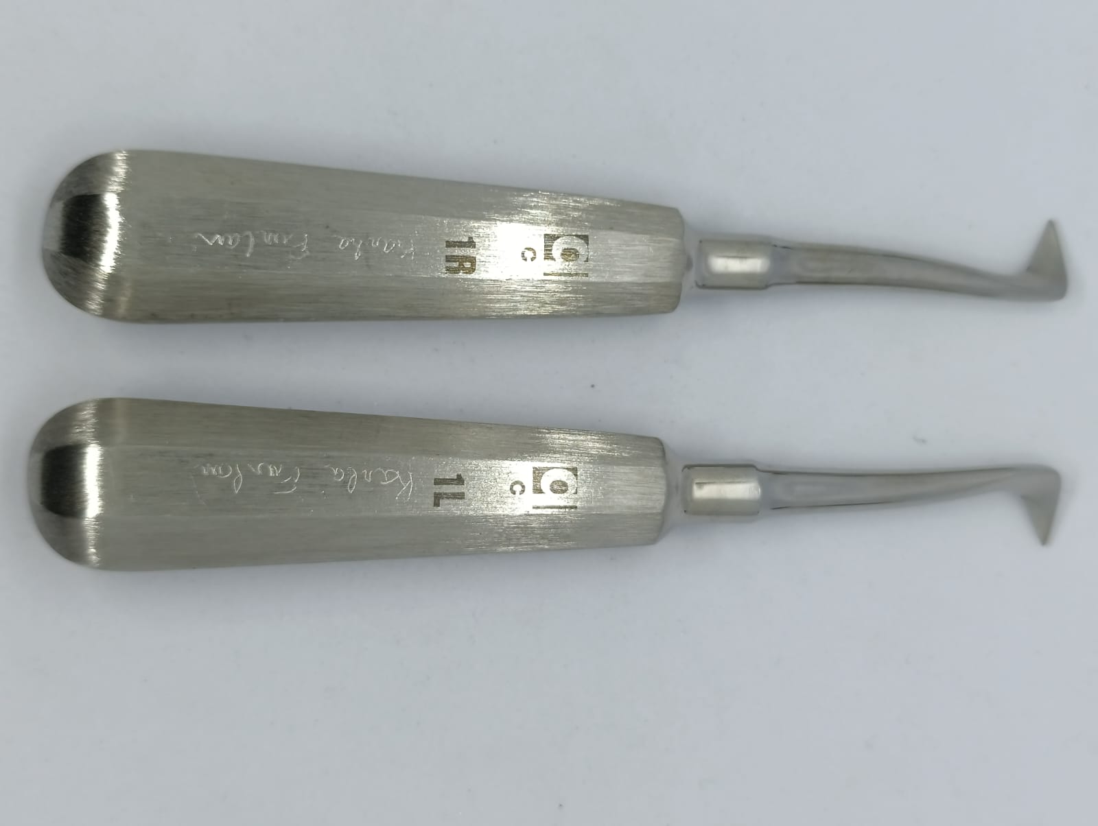 Conjunto de alavancas luxadoras anguladas (1R = direita, 1L = esquerda). Indicadas para facilitar a remoção de raízes ou dentes com difícil acesso, promovendo deslocamento lateral seguro.