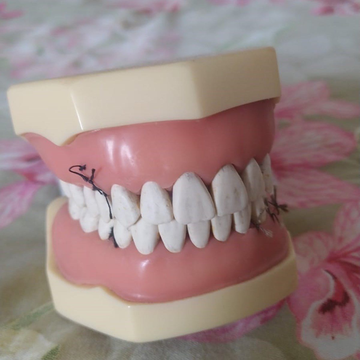 Manequim MOM com dentes de periodontia. Possui algumas suturas na gengiva.