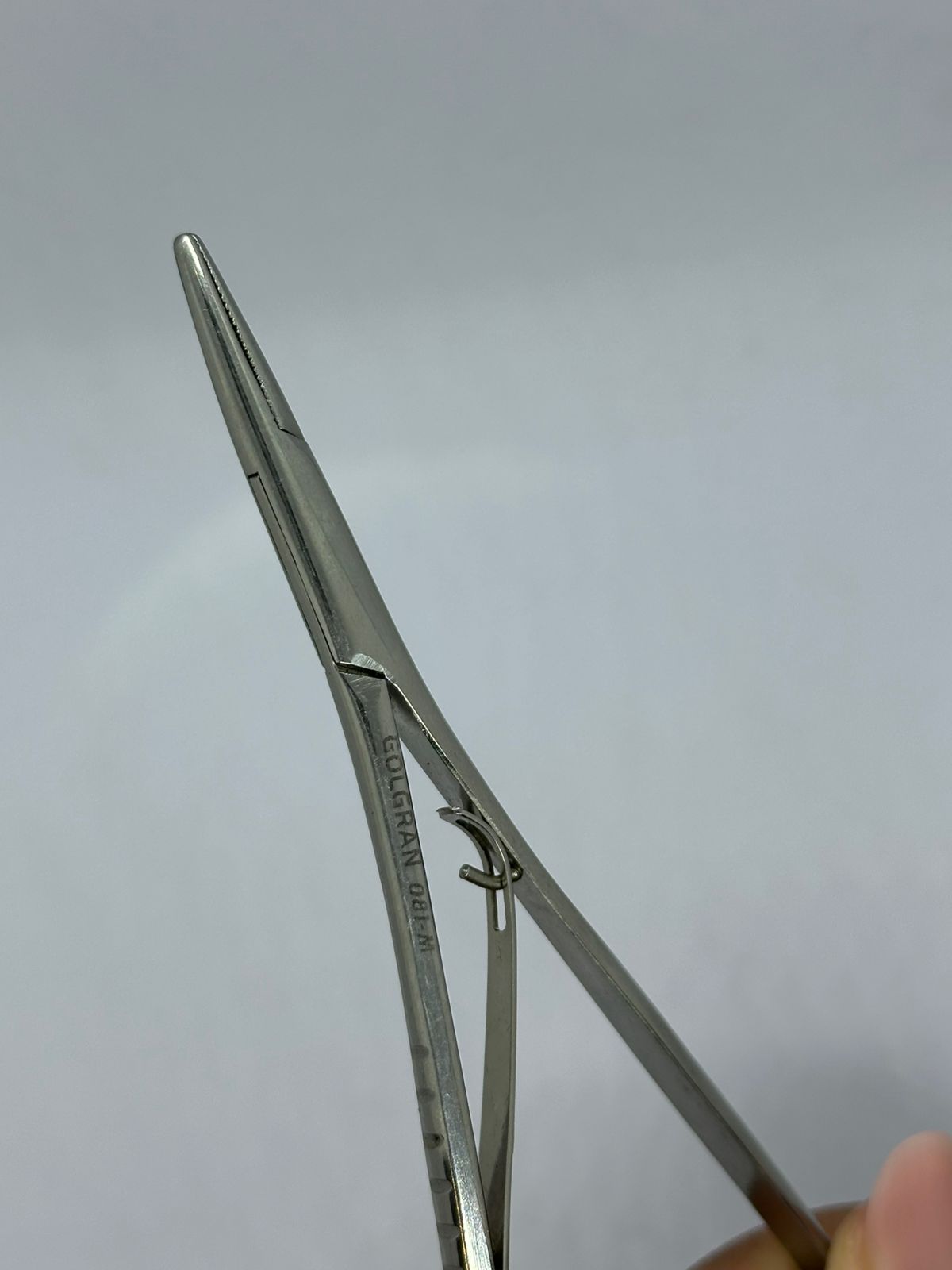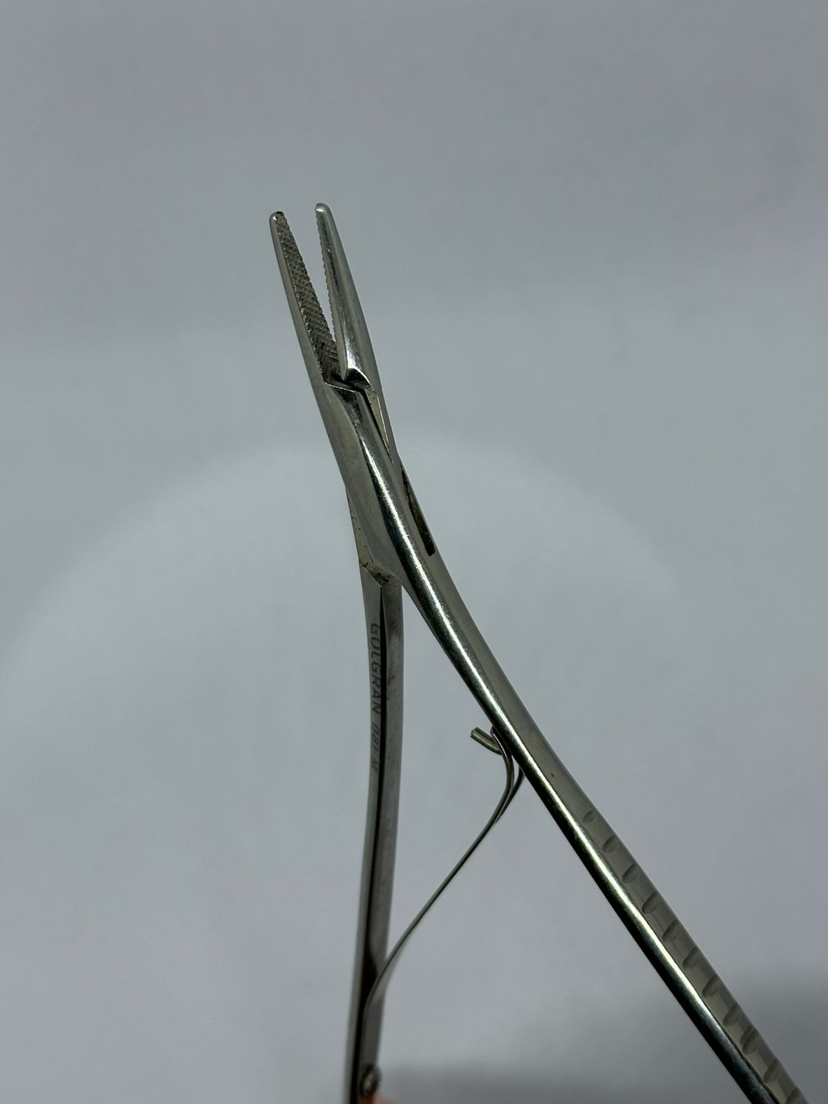 um instrumento cirúrgico amplamente utilizado em procedimentos médicos, odontológicos e veterinários para a fixação de agulhas durante suturas. Seu design com alças curvadas e mecanismo de catraca permite uma preensão firme e controlada da agulha, facilitando a manipulação durante os procedimentos.