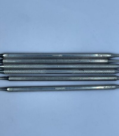 Conjunto de esculpidores duplos utilizados para modelagem de materiais restauradores como resina e amálgama. Cada número possui formatos distintos para diferentes áreas e funções anatômicas.